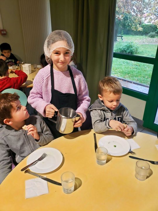 👉 aider les plus petits (maternelles, CP et CE1) à servir l’eau, découper les aliments et accompagner le service.